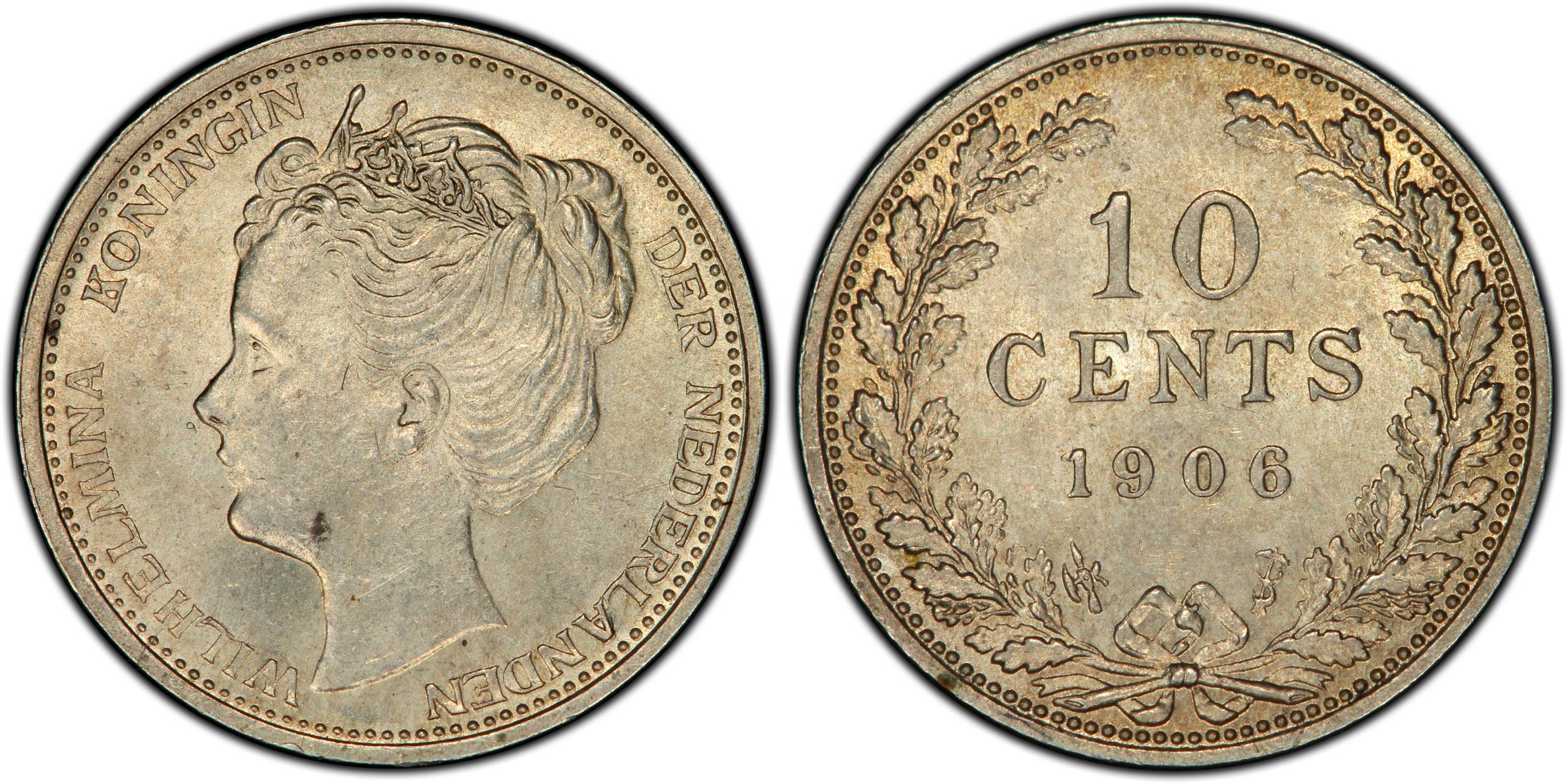 Dit is een door de PCGS gecertificeerde en geslabde zilveren 10 cent 1906 met de pedigree NM collection geslagen onder het heerschap van Koningin Wilhelmina. De door PCGS bepaalde kwaliteit is MS63. Bij PCGS zijn er 5 munten in deze kwaliteit geslabd. Er zijn door PCGS 6 munten geslabd in een hogere MS score. De oplage van het jaar 1906 is 4.000.000 stuks.