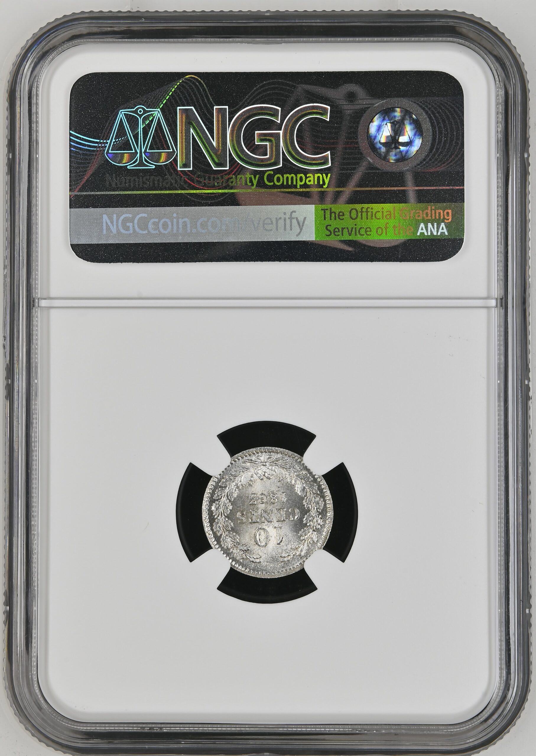 Dit is een door de NGC gecertificeerde en geslabde zilveren dubbeltje / 10 cent 1863 MS65 Koning Willem III. De door NGC bepaalde kwaliteit is MS65. Bij NGC zijn er 2 munten in deze kwaliteit geslabd en één van deze verkopen wij. Er is door NGC geen munt geslabd in een hogere MS score, TOP POP. Dit jaar is bijzonder lastig te vinden, oplage slechts 1.240.000! Wij vinden deze munt t.o.v. PCGS een halve punt aan de hoge kant, met de verkoopprijs is hier rekening mee gehouden!