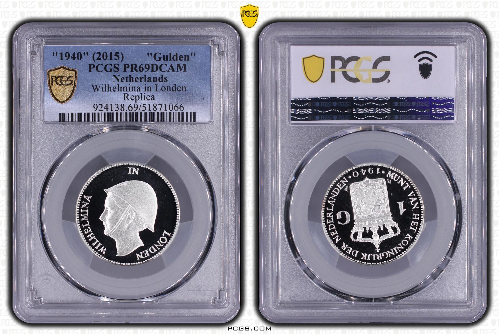 Dit is een door de PCGS gecertificeerde en geslabte zilveren 1 gulden 1940 Wilhelmina in Londen. Deze zilveren muntpenning is geslagen in 2015 door de koninklijke nederlandse munt ter nagedachtenis van de 2e wereldoorlog. Wilhelmina met helm in Londen, waar zij openlijk het verzet steunde tegen de Duitse bezetters. De door PCGS bepaalde kwaliteit is PR69DCAM. Bij PCGS zijn 2 munten tot op heden gecertificeerd in deze kwaliteit. Bij PCGS zijn er geen munten hoger gecertificeerd op het moment van schrijven van dit artikel.