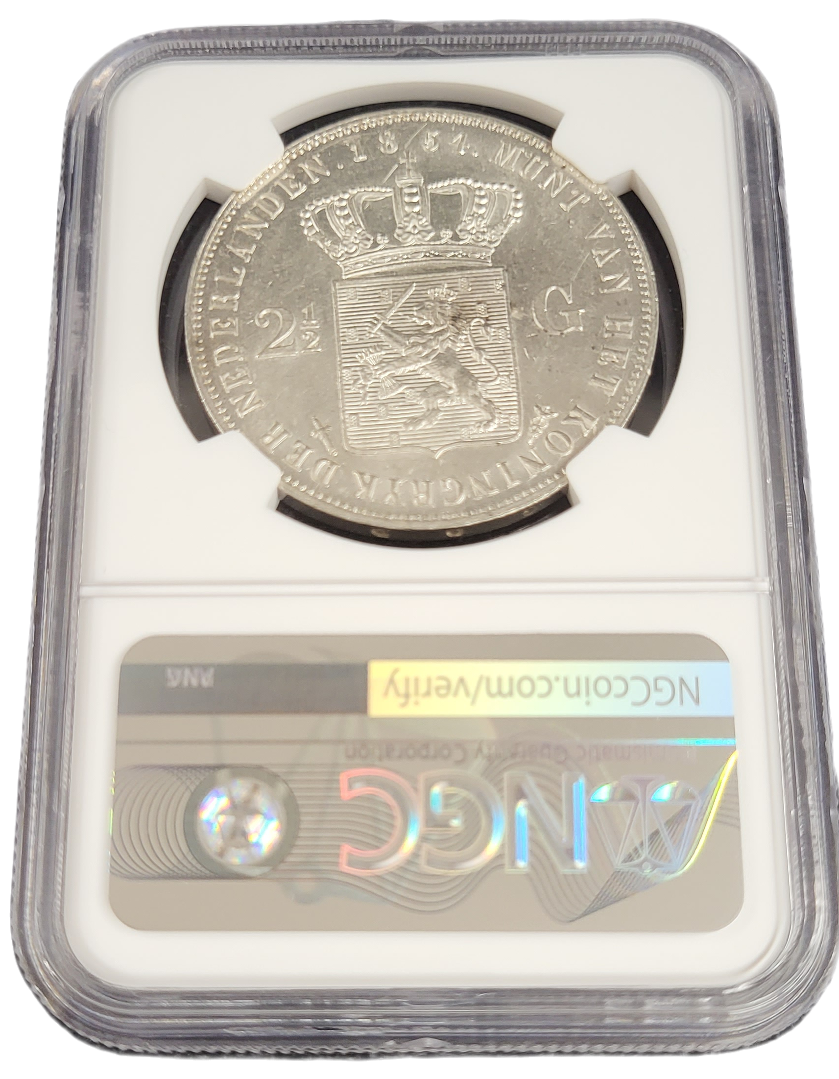 Dit is een door de NGC gecertificeerde 2 1/2 gulden 1854 heeft een door NGC bepaalde kwaliteit van MS61. Er zijn 2 munten in deze kwaliteit geslabd. Er is door NGC maar 1 munt geslabd met een hogere MS certificering.