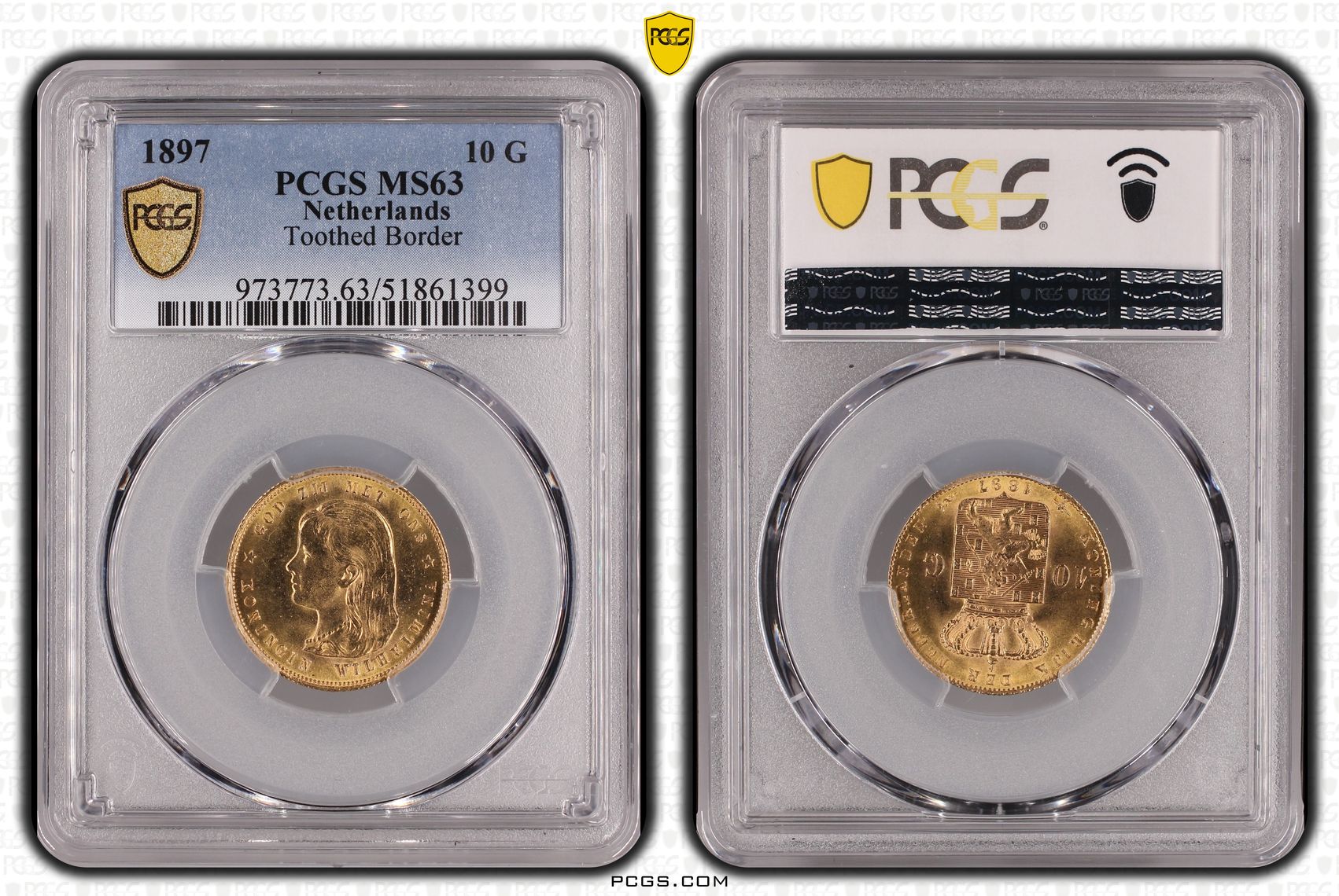 Gouden Wilhelmina 10 gulden 1897 MS63 PCGS vaste parels (pop 10/114)