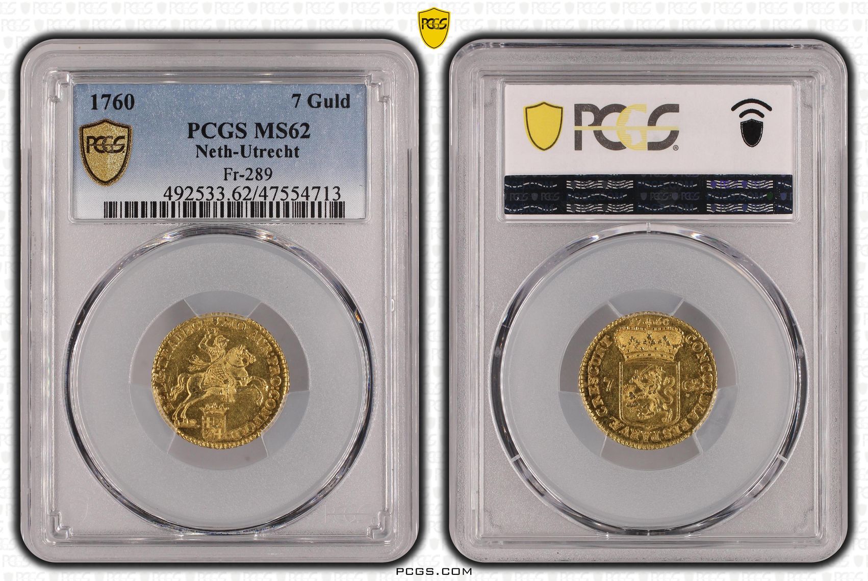 Utrecht halve gouden rijder 1760 MS62, met de waarde van 7 gulden. De door PCGS bepaalde kwaliteit is MS62. Door PCGS is er in 1 munt geslabd in MS62, dit exemplaar. Er is 1 munt hoger gewaardeerd in MS63 en die was afkomstig uit de Coenen collectie. De hele en halve gouden rijders waren in de 17e en 18e eeuw vanwege de hoge waarde geen alledaagse verschijning en vooral bedoeld voor grotere transacties in het Nederlandse handelsverkeer.