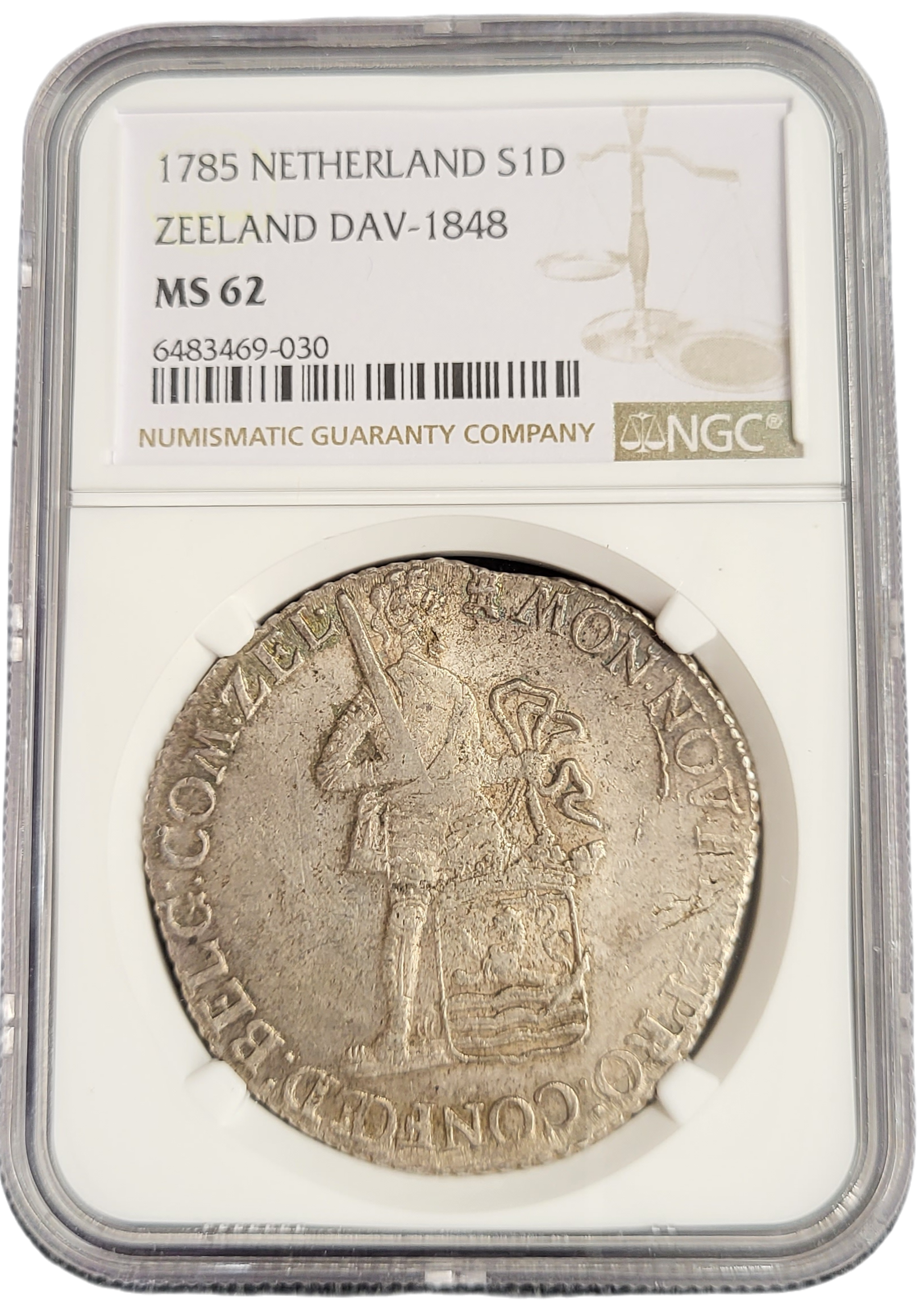 Tijdens de Republiek der zeven Provinciën is deze zilveren dukaat 1785 geslagen in de provincie Zeeland. De munt is gecertificeerd door NGC met de kwalificatie MS62. Van deze munt is dit de enige in de kwaliteit MS62 en geen munten hoger gecertificeerd (Top Pop). Doordat deze munten lang hebben gerouleerd zijn ze niet erg makkelijk te vinden in kwaliteit (ref CNM 2.49.50). De munt is redelijk sterk gemunt voor dit type. met een lichte zwakte in de slag bij de kroon, met schroefpers geslagen. De munt is ongereinigd met een patina.