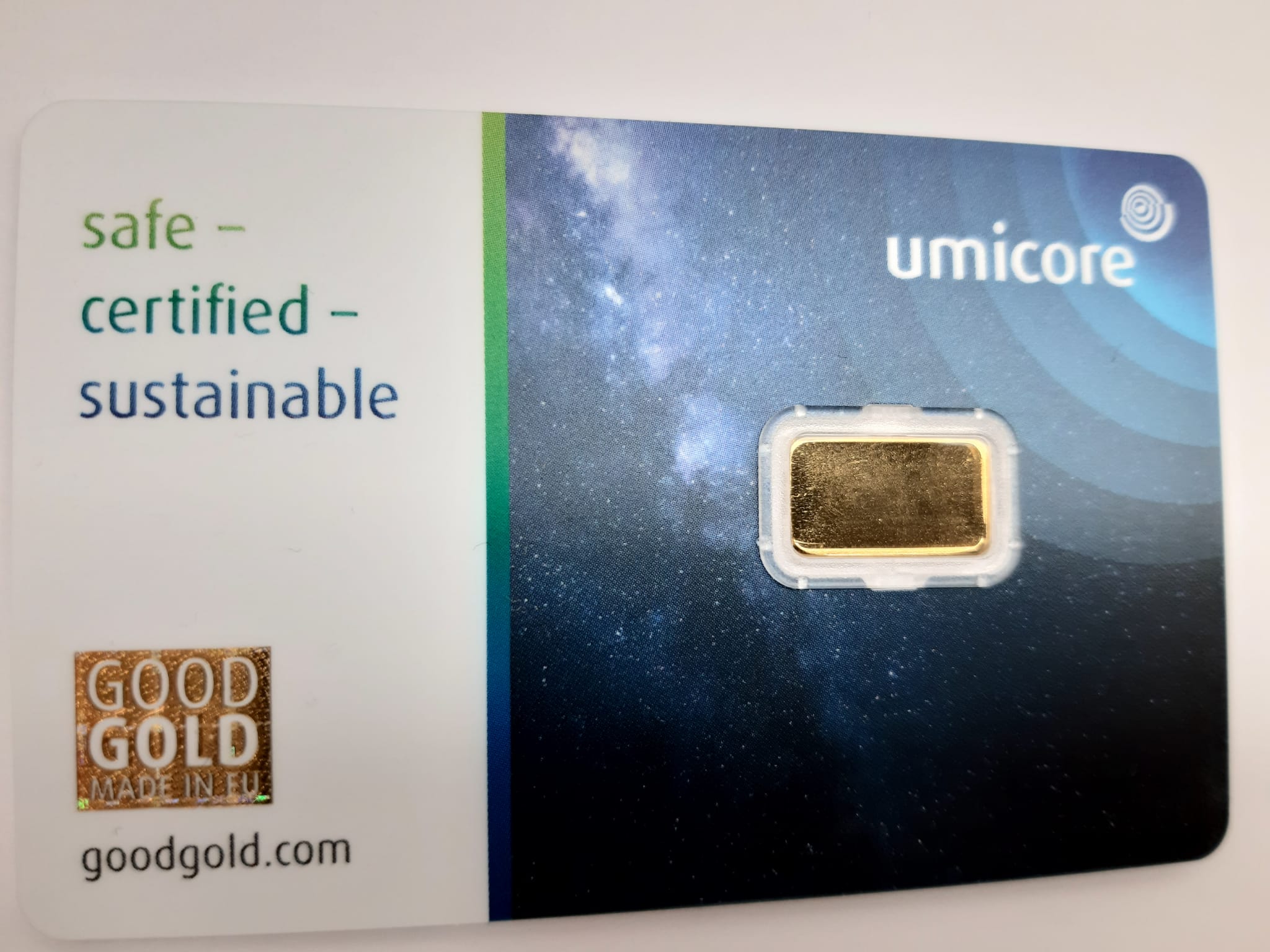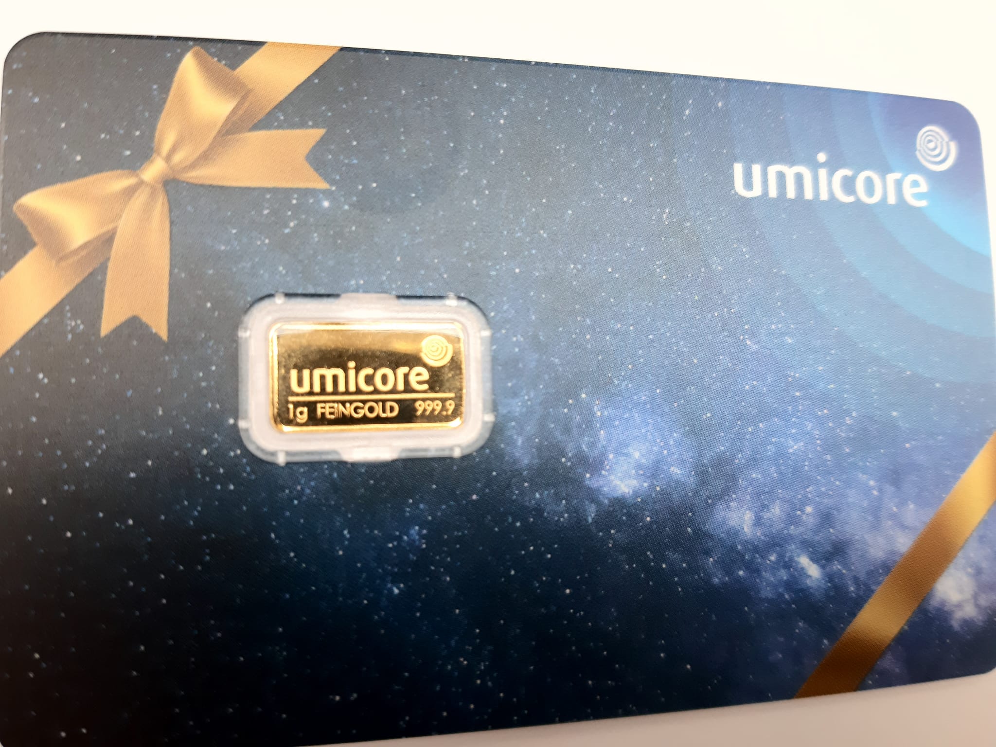 Deze 1 gram goudbaar in giftcard van Umicore heeft een zuiverheid van 999.9 en heeft een “Good Delivery” status. Op deze goudbaar vind u ook het officiële “Umicore Feingold 999.9” keurmerk. Umicore is L.B.M.A. certified, zo bent u verzekerd van de beste kwaliteit en is deze goudbaar ook makkelijk te verhandelen.