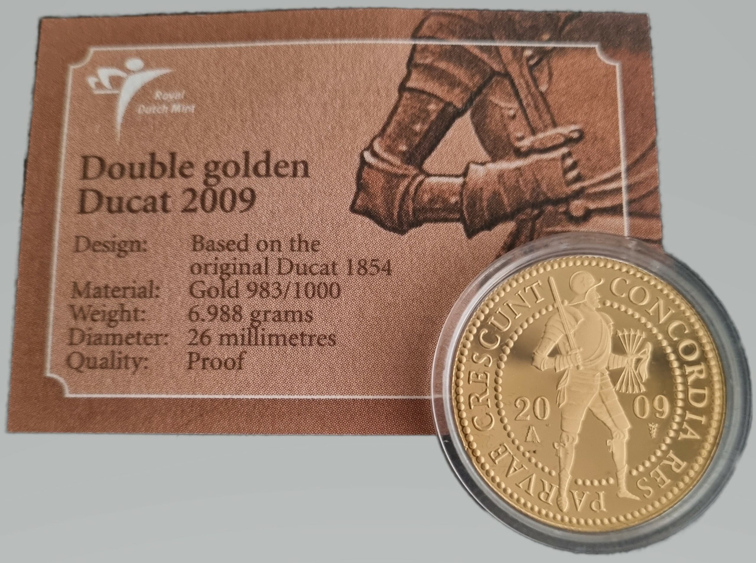 De gouden dubbele dukaat 2009 weegt per stuk 6,988 gram en bevat 983/1000 goud. In elke munt zit 6,86 gram goud. De oplage van het jaar 2009 is 2.000 stuks.