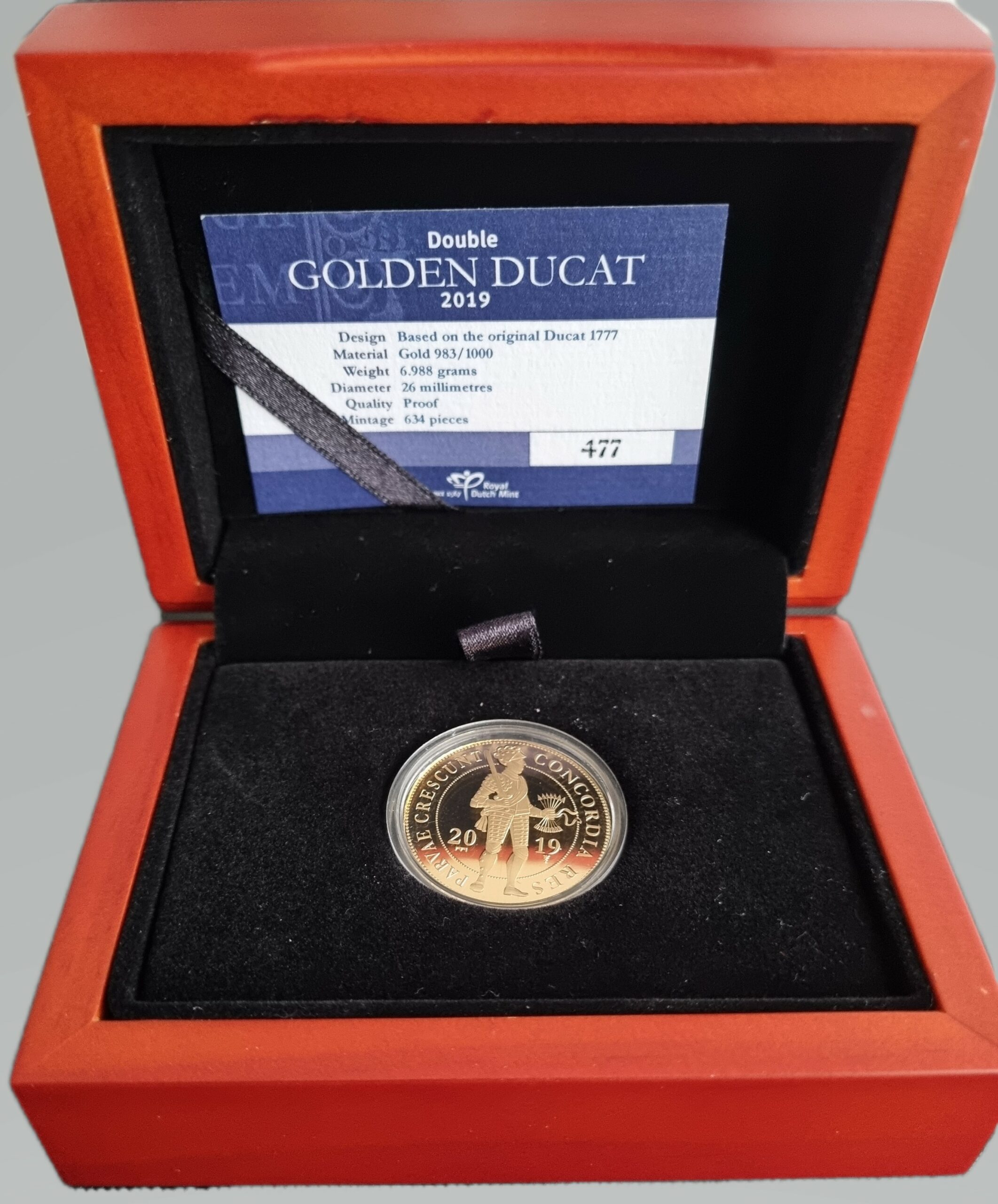 De gouden dubbele dukaat 2019 weegt per stuk 6,988 gram en bevat 983/1000 goud. In elke munt zit 6,86 gram goud. De oplage van het jaar 2019 is 634 stuks