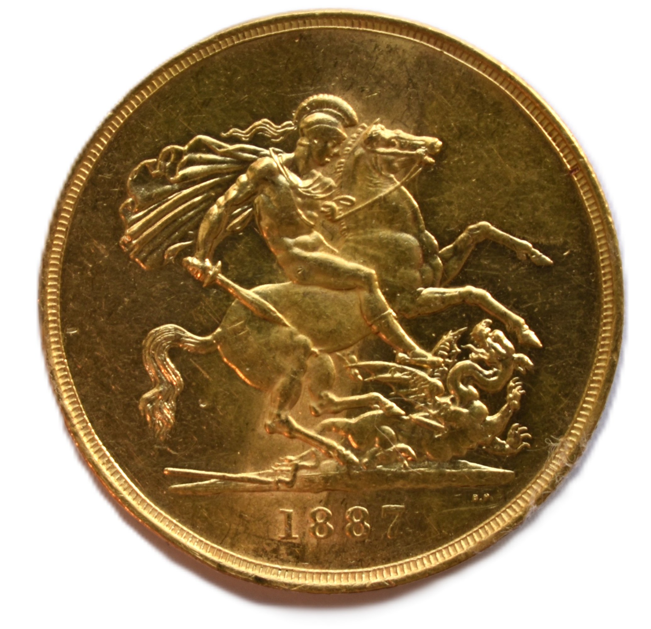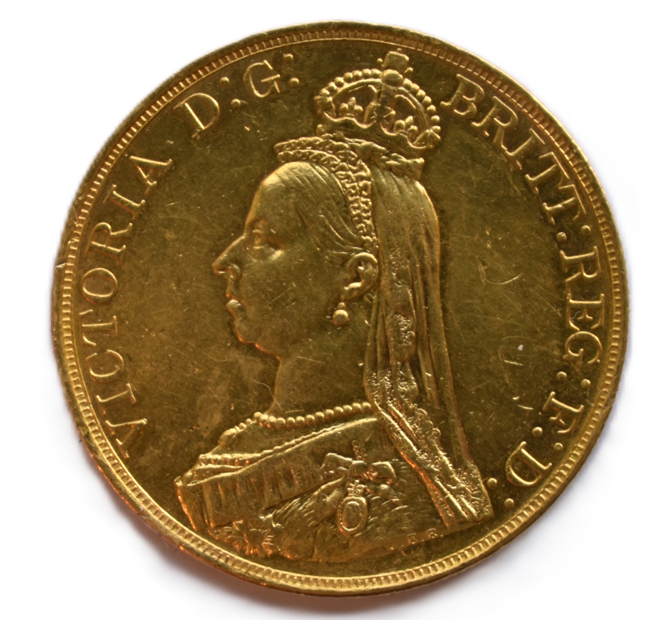 De munt heeft een gewicht dat overeenkomt met vijf Sovereigns en bevat 1,1775 troy ounce (36,61 gram) puur goud (.917). Op de voorzijde prijkt het beroemde ‘Jubilee Head’-portret van Koningin Victoria, terwijl de keerzijde het legendarische ontwerp van Sint-Joris en de draak van Benedetto Pistrucci toont.