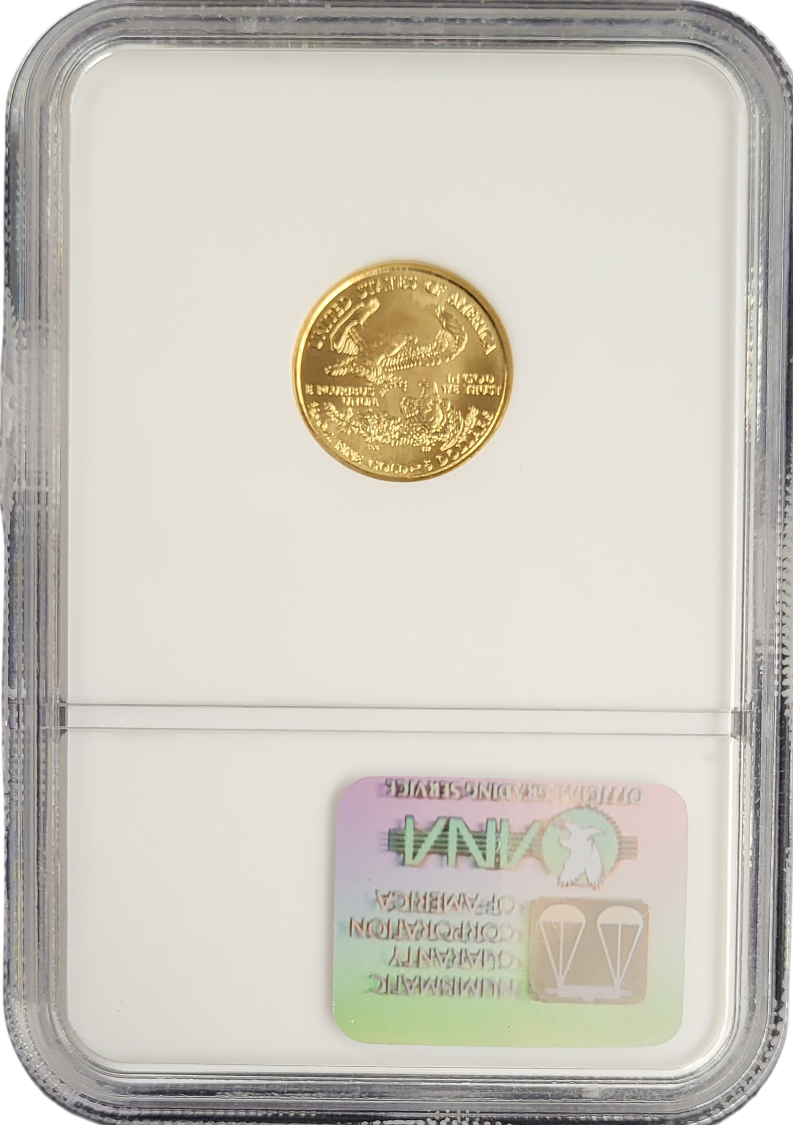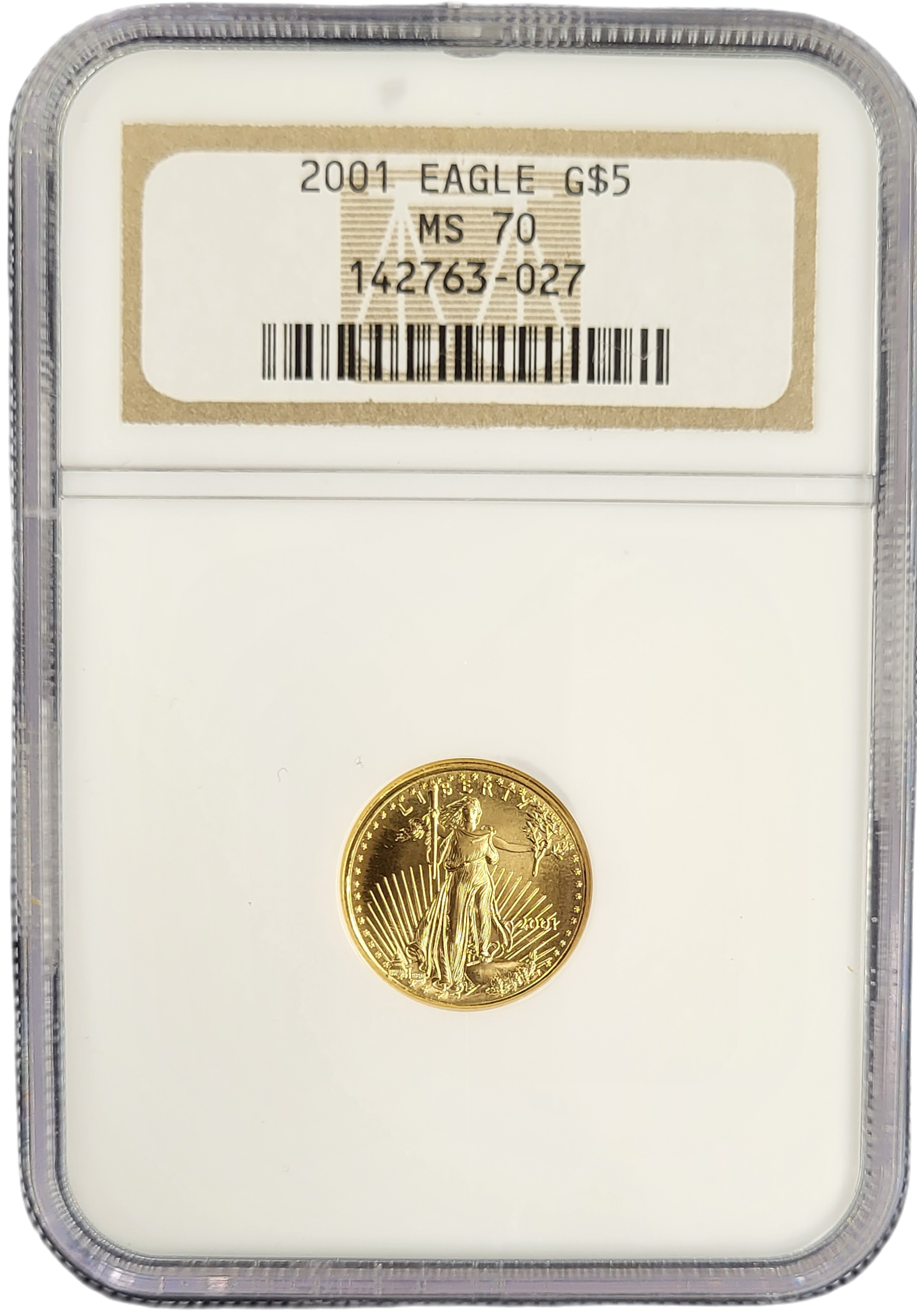 De Gouden American Eagle 1/10 oz 2001 is een prachtige Amerikaanse munt uitgegeven door de U.S Mint. Op de voorkant staat een prachtige afbeelding van de Eagle, op de achterkant het portret van Walking Liberty. De munt is gegraded door NGC en beoordeeld met een kwaliteitsscore van MS70 TOP POP (munten kunnen een score krijgen van 1 t/m 70 waarbij 70 de hoogst mogelijke score is). De gouden American Eagles bestaat voor 91,67% uit goud, voor 3% uit zilver en voor 5,33% uit koper. Deze munt weegt 3,39 gram en bevat 3,11 gram aan goud, wat daarmee exact uitkomt op 1/10 ounce goud. De denominatie van deze munt (Face Value) is 5 dollars.