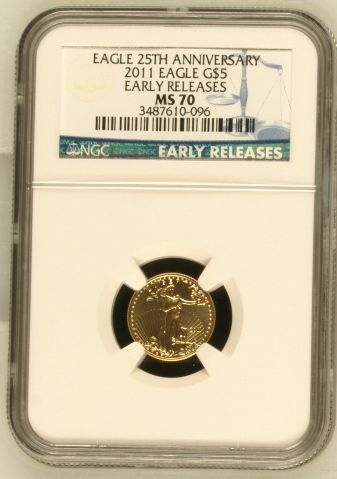 De Gouden American Eagle 1/10 oz 2011 E.R. 25TH ANNIVERSARY is een prachtige Amerikaanse munt uitgegeven door de U.S Mint. Op de voorkant staat een prachtige afbeelding van de Eagle, op de achterkant het portret van Walking Liberty. De munt is gegraded door NGC en beoordeeld met een kwaliteitsscore van MS70 (munten kunnen een score krijgen van 1 t/m 70 waarbij 70 de hoogst mogelijke score is). De gouden American Eagles bestaat voor 91,67% uit goud, voor 3% uit zilver en voor 5,33% uit koper. Deze munt weegt 3,39 gram en bevat 3,11 gram aan goud, wat daarmee exact uitkomt op 1/10 ounce goud. De denominatie van deze munt (Face Value) is 5 dollars.