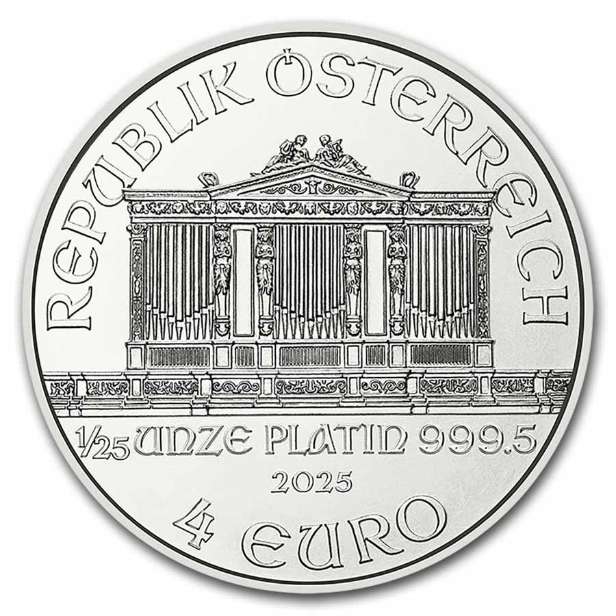 De Wiener Philharmoniker 1/25 oz 2025 bevat een platina gehalte van 99,95% en is geslagen door de Austria Mint. De zuiverheid is de hoogste van alle bekende platina beleggingsmunten. De munten bevatten exact 1/25 Troy ounce platina = 1.244 gram.