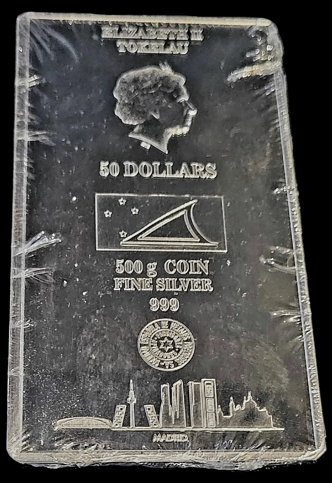 Officiële munteenheid van de Tokelau-archipel in de vorm van een baar of “Coin Bar” met de skyline van de stad Madrid als hoofdthema en met de vlag van de archipel.