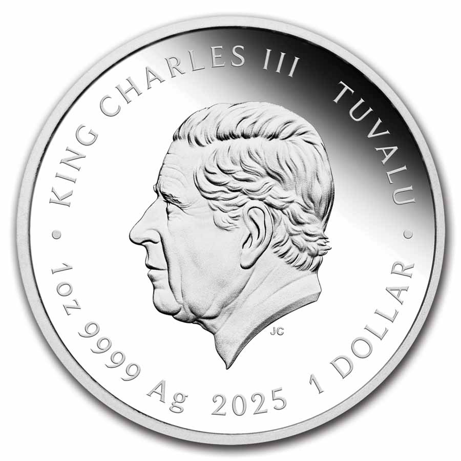 Op de voorzijde van de munt ziet u Koning Charles III, de munteenheid, het gewicht, de fijnheid van de munt en het jaar van uitgifte.